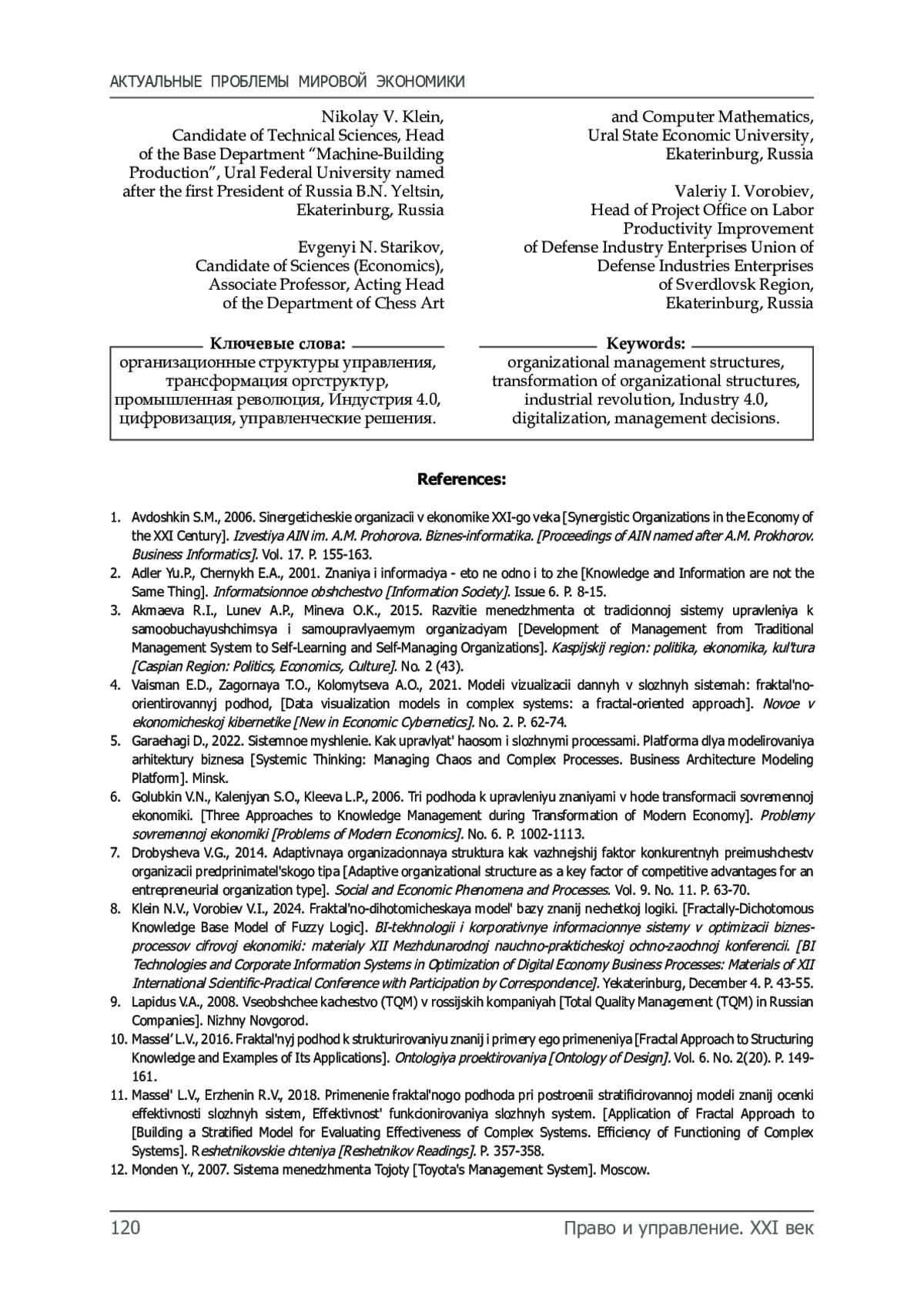 8. Клейн Н.В., Воробьев В.И. Фрактально-дихотомическая модель базы знаний нечеткой логики // BI-технологии и корпоративные информационные системы в оптимизации бизнес-процессов цифровой экономики: материалы XII Международной научно-практической очно-заочной конференции, Екатеринбург, 4 декабря 2024 г. С. 43-55.
