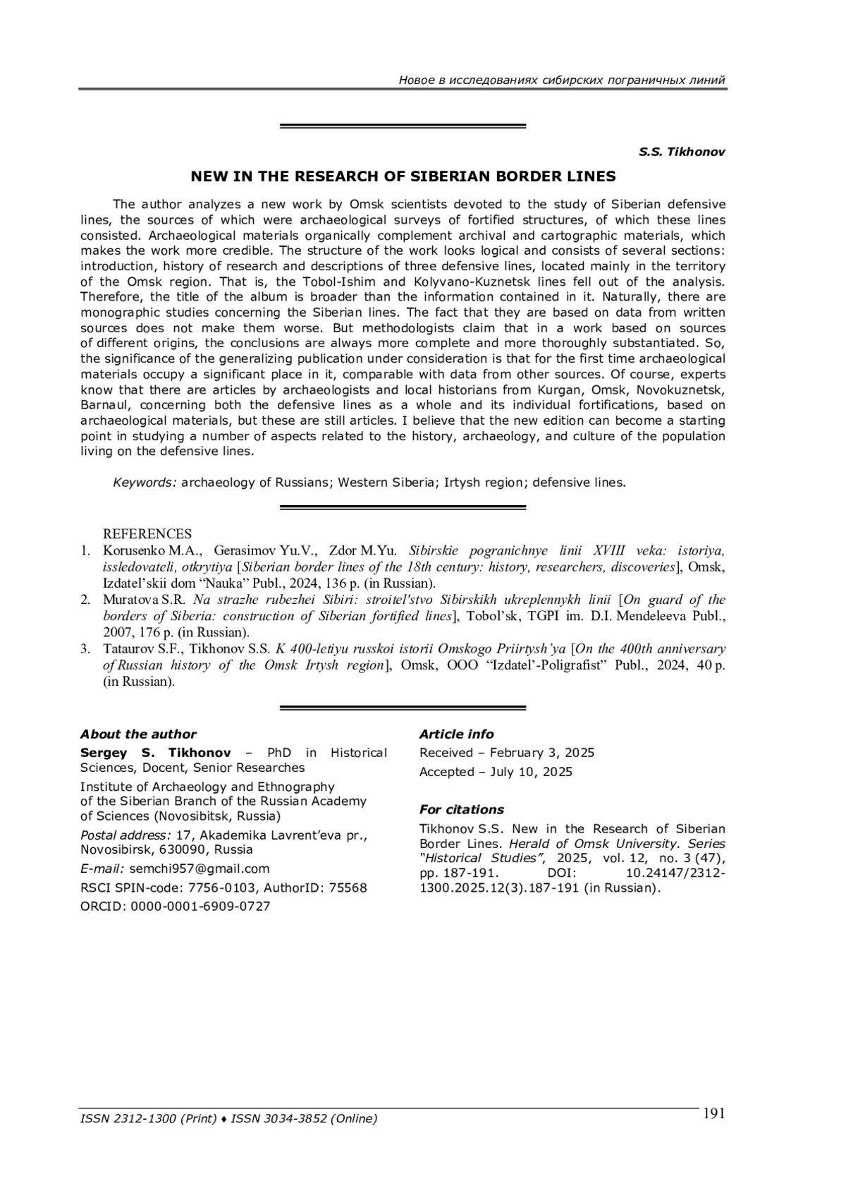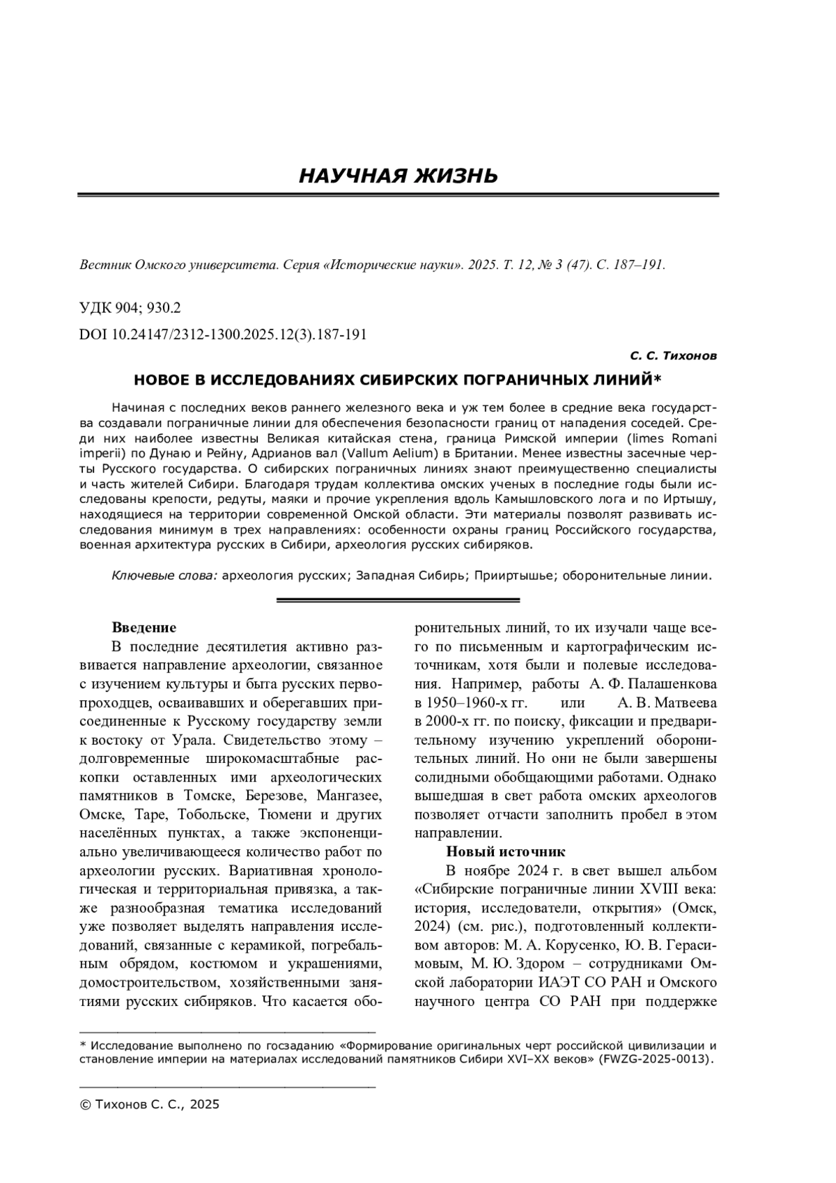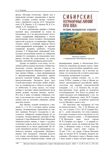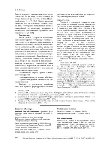 1. Корусенко М. А., Герасимов Ю. В., Здор М. Ю. Сибирские пограничные линии XVIII века: история, исследователи, открытия. - Омск: Издат. дом “Наука”, 2024. - 136 с.