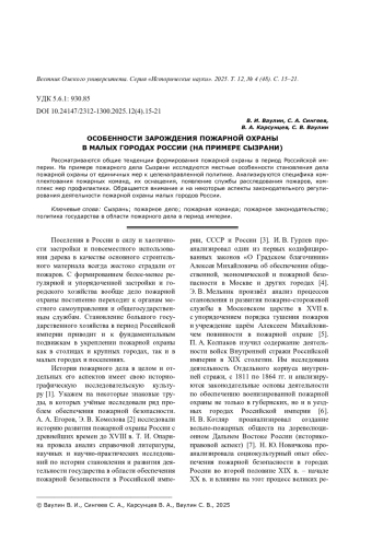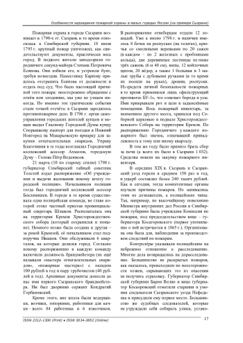Рассматриваются общие тенденции формирования пожарной охраны в период Российской империи. На примере пожарного дела Сызрани исследуются местные особенности становления дела пожарной охраны от единичных мер к целенаправленной политике. Анализируются специфика комплектования пожарных команд, их оснащения, появление службы расследования пожаров, комплекс мер профилактики. Обращается внимание и на некоторые аспекты законодательного регулирования деятельности пожарной охраны малых городов России.