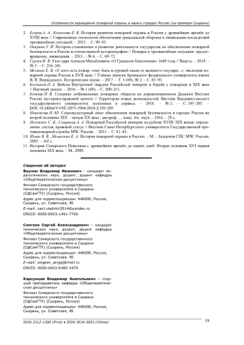 5. Мельник Е. В. “У кого есть пожар, тому быть в суровой опале от великого государя.”.: эволюция пожарной охраны России в XVII веке // Учёные записки Крымского федерального университета имени В. И. Вернадского. Исторические науки. - 2017. - Т. 3 (69), № 2. - С. 85-93. EDN: YMIPTO