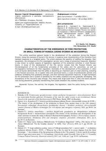 1. Бабенко А. М. Становление государственной системы пожарной безопасности в дореволюционной России (на материалах Курской губернии): дис. … канд. ист. наук. - Курск, 2005. EDN: NNFEWR
