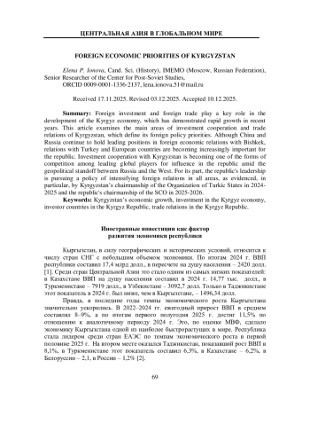 Иностранные инвестиции и внешняя торговля играют ключевую роль в развитии экономики Кыргызстана, которая в последние годы демонстрирует быстрые темпы роста. В статье рассматриваются основные направления инвестиционного сотрудничества и торговых отношений Кыргызстана, которые определяют его внешнеполитические приоритеты. Хотя Китай и Россия по-прежнему сохраняют лидирующие позиции во внешнеэкономических отношениях с Бишкеком, все более значимую роль приобретают для республики отношения с Турцией и европейскими странами. Инвестиционное сотрудничество с Кыргызстаном становится одной из форм борьбы ведущих мировых игроков за влияние в республике на фоне геополитического противостояния России и Запада. Со своей стороны, руководство республики проводит курс на активизацию внешних связей по всем направлениям, о чем свидетельствует, в частности, председательство Кыргызстана в Организации тюркских государств в 2024–2025 гг. и председательство республики в ШОС в 2025–2026 гг.