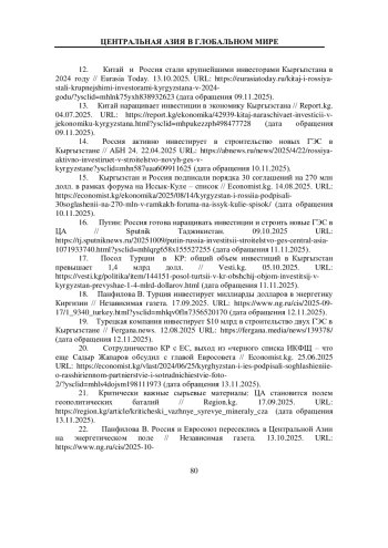 13. Китай наращивает инвестиции в экономику Кыргызстана // Report.kg. 04.07.2025. URL: https://report.kg/ekonomika/42939-kitaj-naraschivaet-investicii-v-jekonomiku-kyrgyzstana.html?ysclid=mhpukezzph498477728 (дата обращения 09.11.2025).