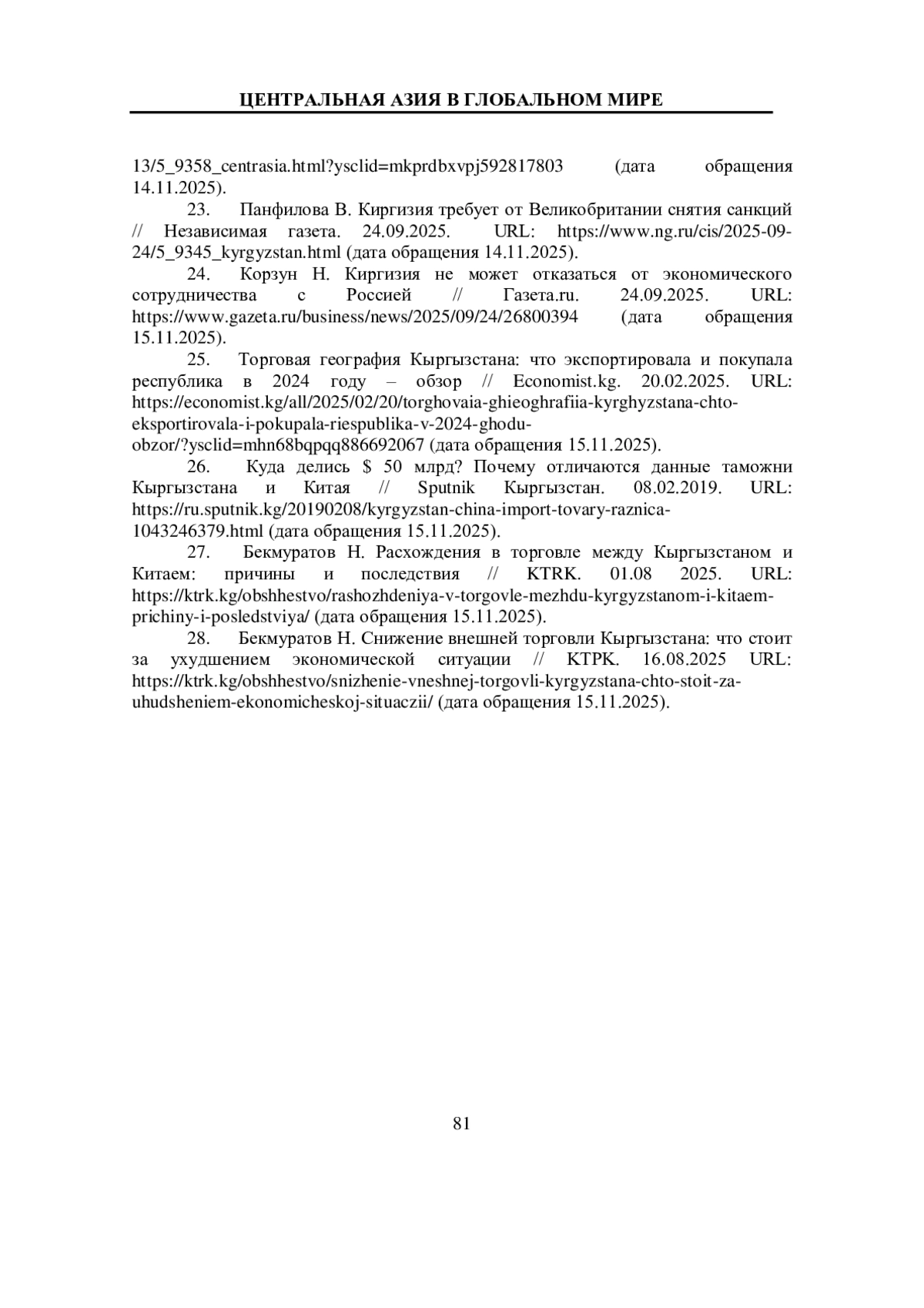 27. Бекмуратов Н. Расхождения в торговле между Кыргызстаном и Китаем: причины и последствия // KTRK. 01.08 2025. URL: https://ktrk.kg/obshhestvo/rashozhdeniya-v-torgovle-mezhdu-kyrgyzstanom-i-kitaem-prichiny-i-posledstviya/(дата обращения 15.11.2025).