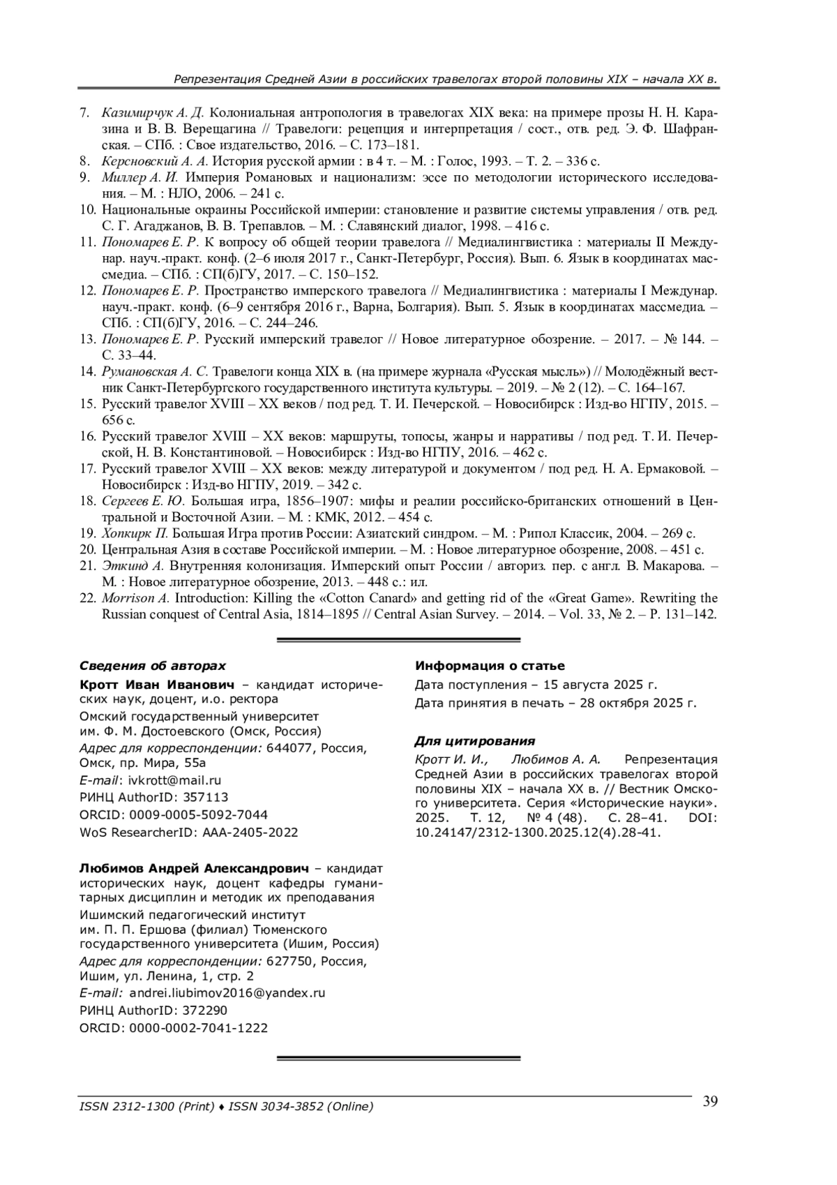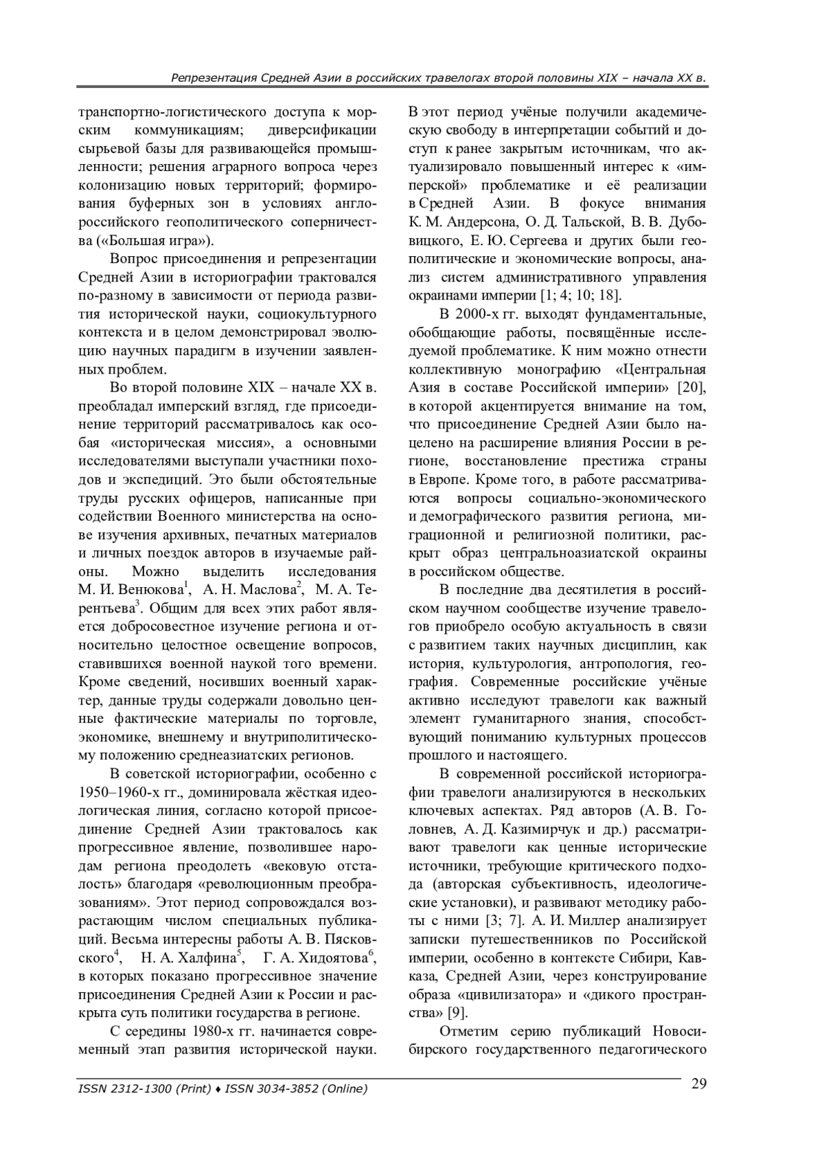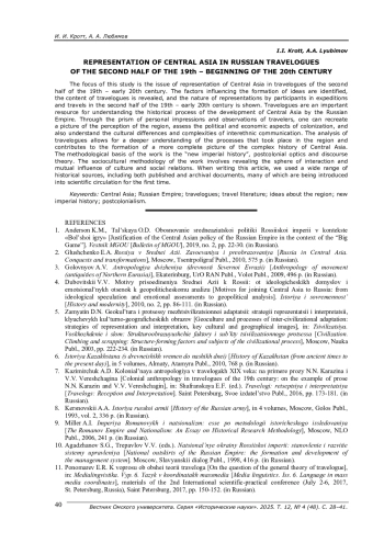 1. Андерсон К. М., Тальская О. Д. Обоснование среднеазиатской политики Российской империи в контексте “Большой игры” // Вестник МГОУ. - 2019. - № 2. - С. 22-30. EDN: UEHJEP