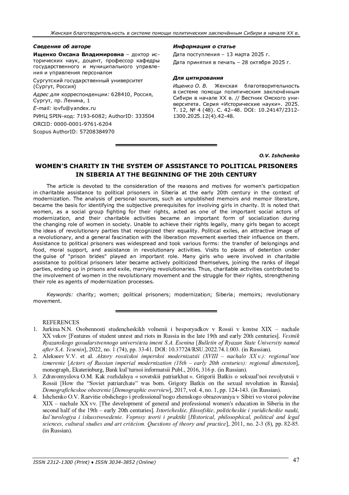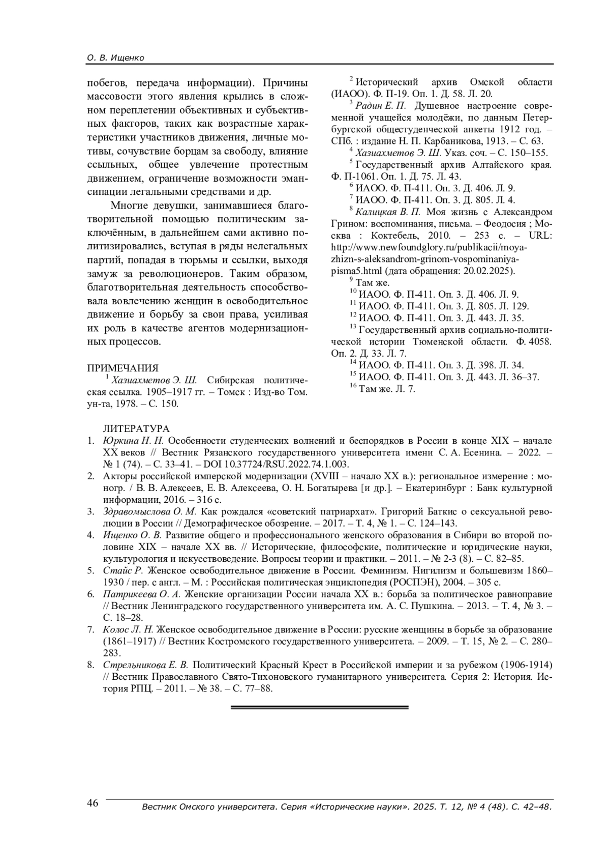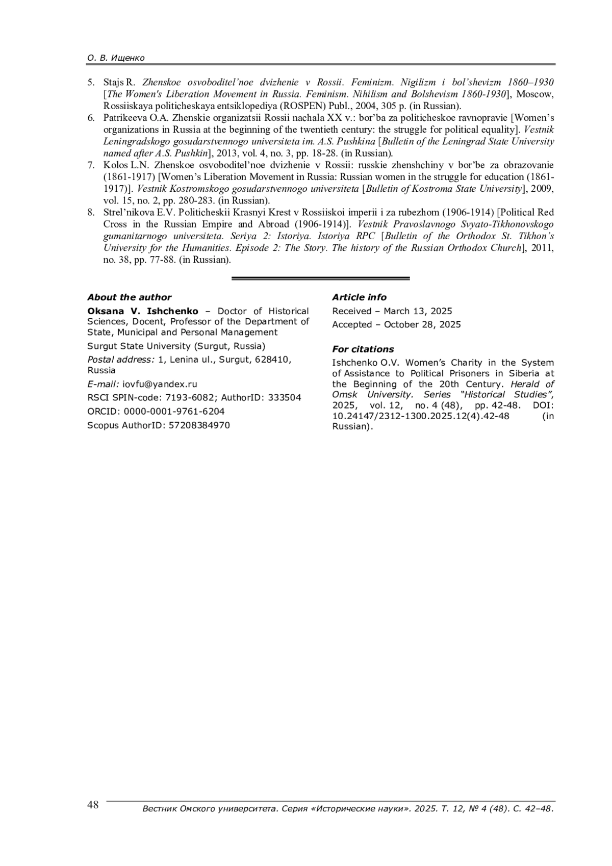 4. Ищенко О. В. Развитие общего и профессионального женского образования в Сибири во второй половине XIX - начале ХХ вв. // Исторические, философские, политические и юридические науки, культурология и искусствоведение. Вопросы теории и практики. - 2011. - № 2-3 (8). - С. 82-85. EDN: OEDWQZ