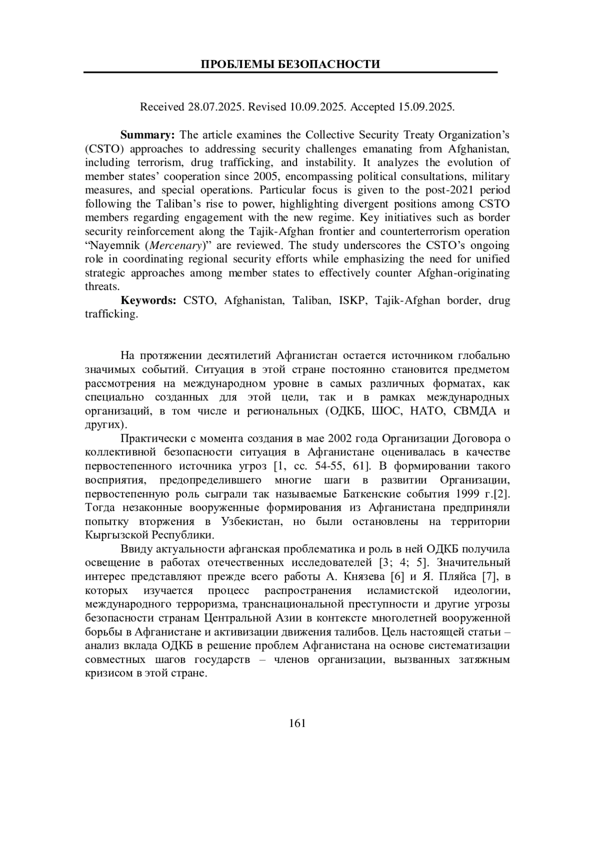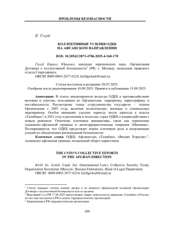 В статье анализируются подходы ОДКБ к противодействию вызовам и угрозам, исходящим из Афганистана: терроризму, наркотрафику и нестабильности. Рассмотрены этапы сотрудничества государств – членов Организации с 2005 года, включая политические, военные и специальные мероприятия. Особое внимание уделено периоду после прихода к власти «Талибана»2 в 2021 году и различиям в подходах стран ОДКБ к взаимодействию с новым режимом. Отмечены ключевые инициативы, такие как укрепление таджикско-афганской границы и антитеррористическая операция «Наемник». Подчеркивается, что ОДКБ продолжает играть ключевую роль в координации усилий по обеспечению региональной безопасности.