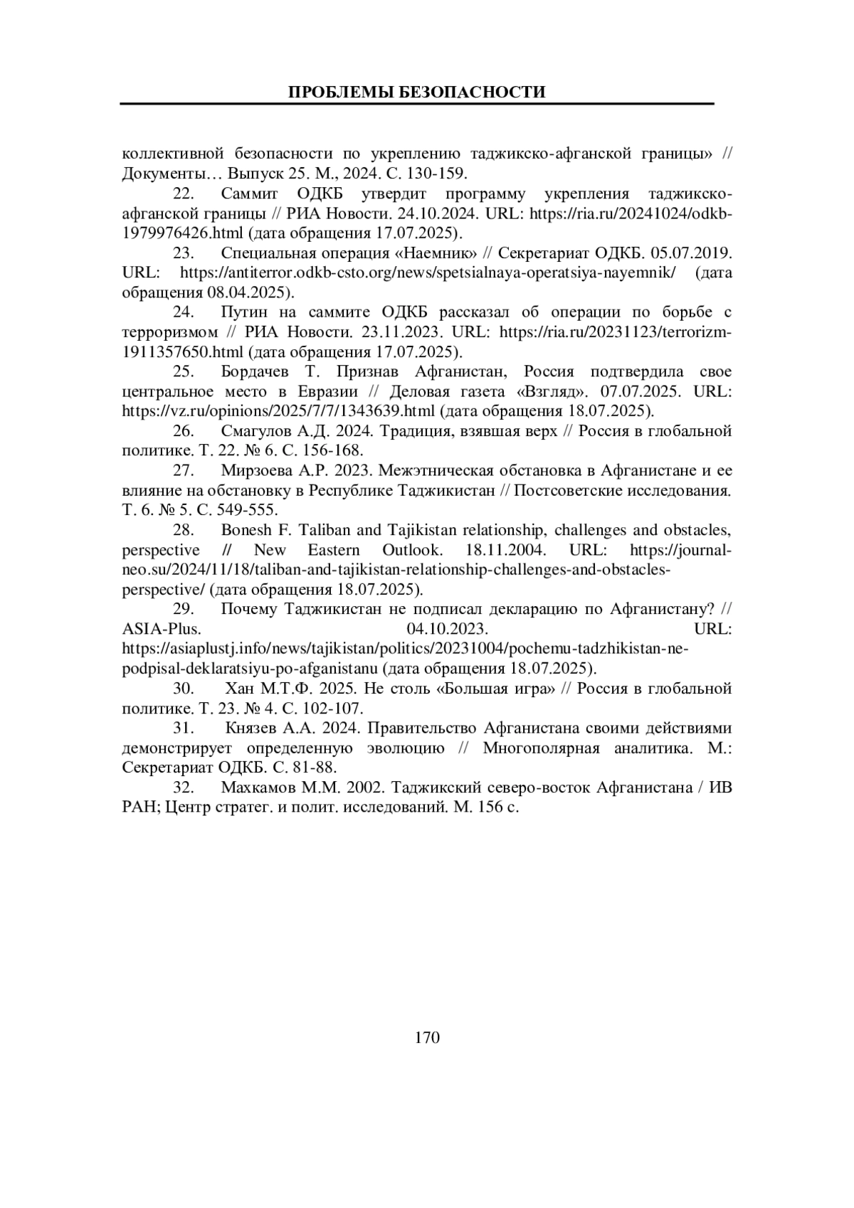 25. Бордачев Т. Признав Афганистан, Россия подтвердила свое центральное место в Евразии // Деловая газета “Взгляд”. 07.07.2025. URL: https://vz.ru/opinions/2025/7/7/1343639.html (дата обращения 18.07.2025).
