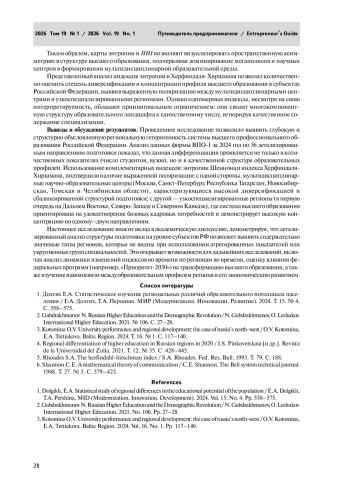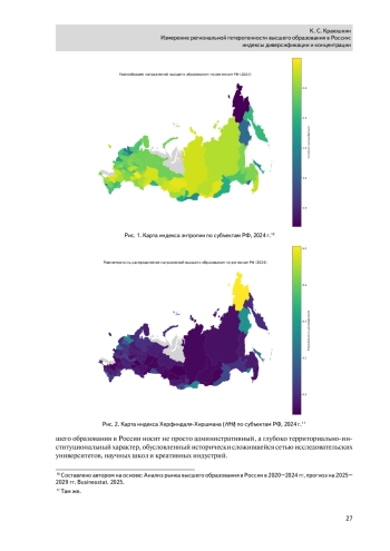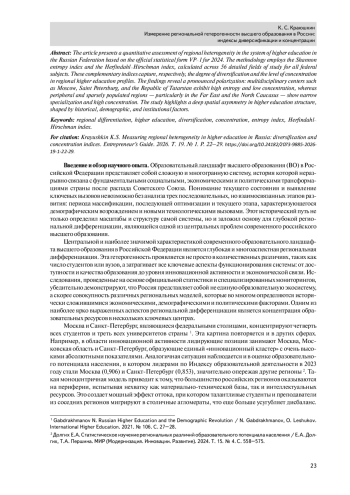 В статье представлено количественное измерение региональной гетерогенности системы высшего образования в Российской Федерации на основе данных статистической формы ВПО–1 за 2024 год. В качестве методологических инструментов использованы индекс энтропии Шеннона и индекс Херфиндаля–Хиршмана, рассчитанные по 56 укрупненным группам направлений подготовки для всех субъектов страны. Эти индексы позволяют оценить, с одной стороны, степень диверсификации образовательных профилей регионов, а с другой — уровень концентрации подготовки в отдельных направлениях. Результаты выявили выраженную поляризацию: мультидисциплинарные центры (Москва, Санкт–Петербург, Республика Татарстан и др.) демонстрируют высокую энтропию и низкую концентрацию, тогда как периферийные и малонаселенные регионы (в частности на Дальнем Востоке и Северном Кавказе) характеризуются узкой специализацией и высоким уровнем концентрации. Анализ подчеркивает глубокую территориальную асимметрию в структуре высшего образования, обусловленную историческими, демографическими и институциональными факторами.