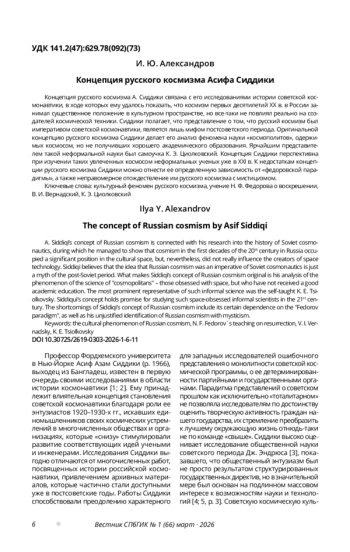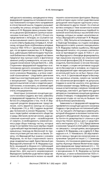Некоторые положения концепции русского космизма Сиддики, все-таки, зависимы от федоровской парадигмы. В частности, ошибочно его утверждение о том, что В. И. Вернадский разделял федоровские представления, «хотя, вероятно никогда не слышал о Федорове» [16, p. 80]. Сиддики выделяет два положения в учении Федорова: 1) призыв к перестройке человеческого общества и среды обитания, включая космос, ради достижения конечной цели – «освобождения от смерти»; 2) необходимость освоения космоса ради сбора повсюду частиц, которые когда-то составляли тела ныне мертвых людей с дальнейшей перспективой расселения воскрешенных повсюду во Вселенной по причине отсутствия для них места на Земле.