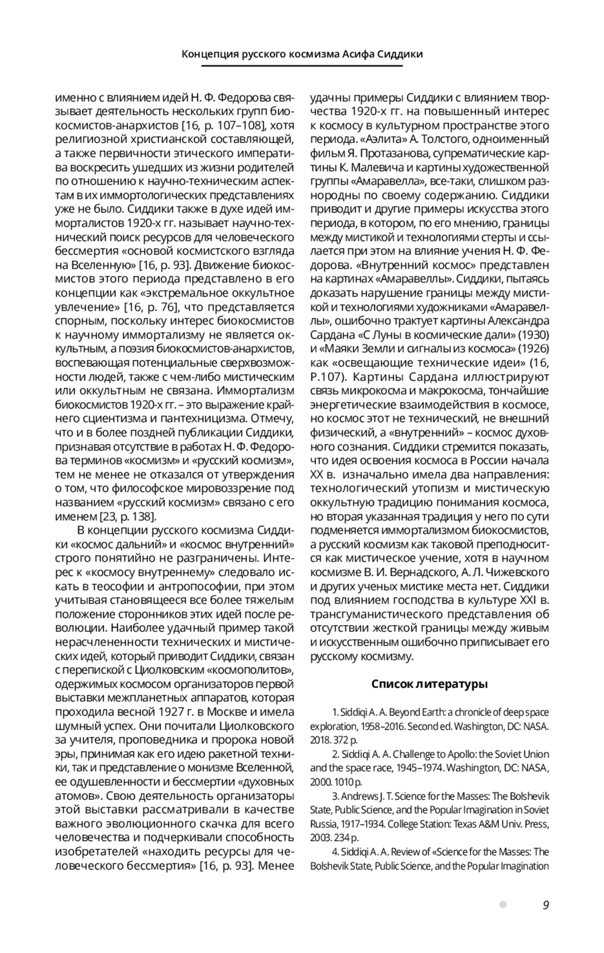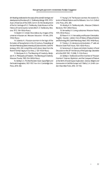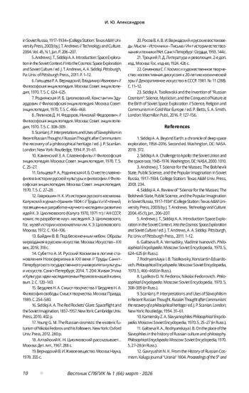 23. Siddiqi A. Tsiolkovskii and the Invention of “Russian Cosmism”: Science, Mysticism, and the Conquest of Nature at the Birth of Soviet Space Exploration // Science, Religion and Communism in Cold War Europe / ed. P. Betts, S. A. Smith. London: Macmillan Publ., 2016. P. 127-156.
