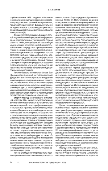 6. Уваров А. Ю. От компьютеризации и информатизации к цифровой трансформации школы // Россия в ХХI веке: образование как важный цивилизационный институт развития и формирования российской культурно-исторической идентичности: сб. докл. и материалов ХХX Моисеевских чтений - науч.-практ. конф. Москва: Акад. МНЭПУ, 2022. С. 388-397.