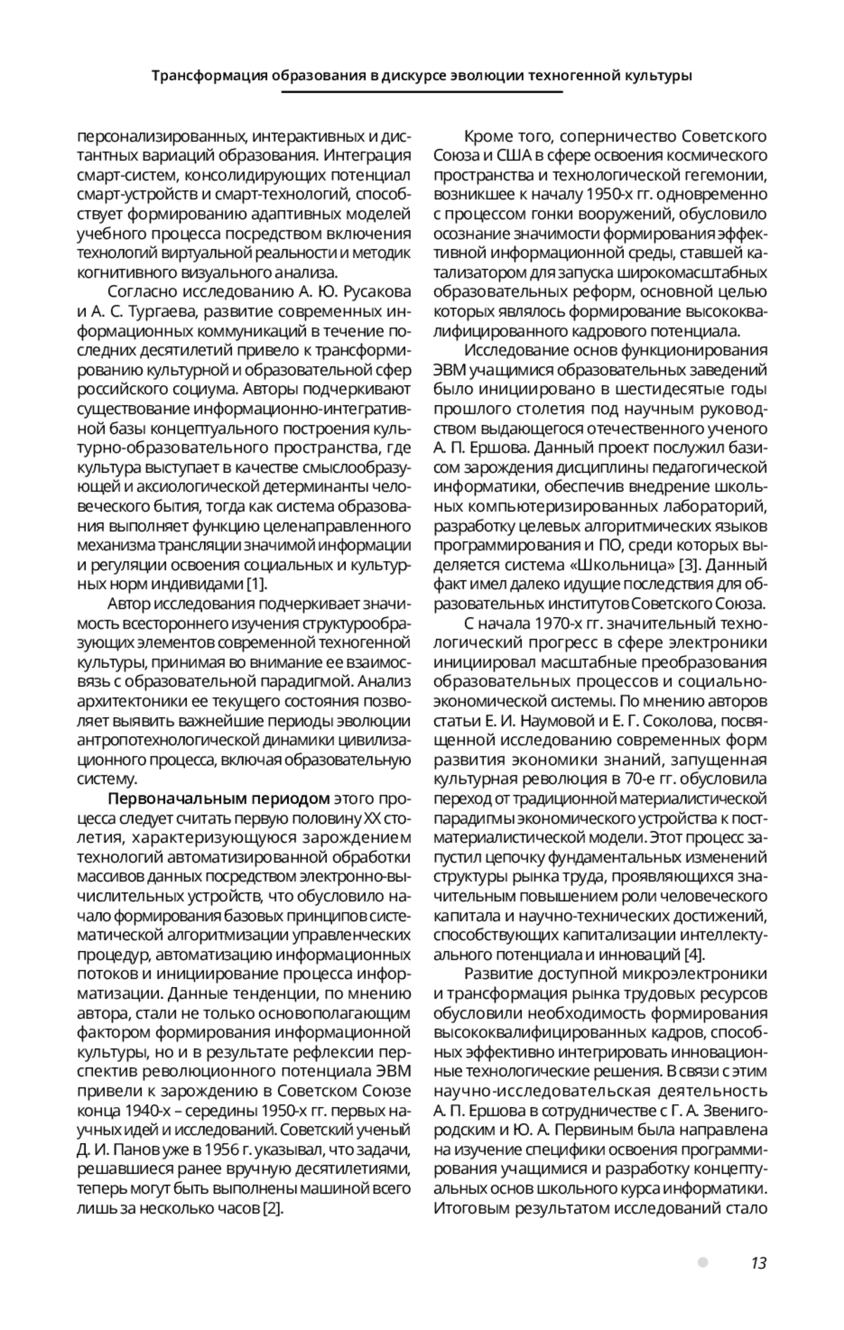Согласно исследованию А. Ю. Русакова и А. С. Тургаева, развитие современных информационных коммуникаций в течение последних десятилетий привело к трансформированию культурной и образовательной сфер российского социума. Авторы подчеркивают существование информационно-интегративной базы концептуального построения культурно-образовательного пространства, где культура выступает в качестве смыслообразующей и аксиологической детерминанты человеческого бытия, тогда как система образования выполняет функцию целенаправленного механизма трансляции значимой информации и регуляции освоения социальных и культурных норм индивидами [1].
