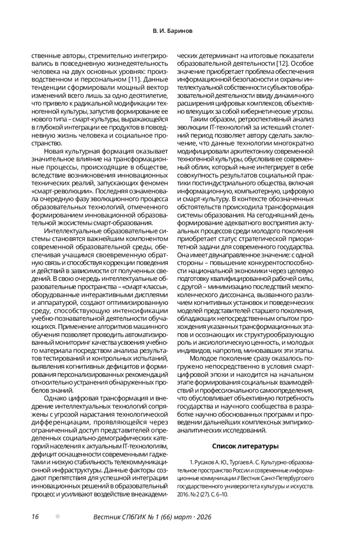 1. Русаков А. Ю., Тургаев А. С. Культурно-образовательное пространство России и современные информационные коммуникации // Вестник Санкт-Петербургского государственного университета культуры и искусств. 2016. № 2 (27). С. 6-10.