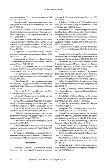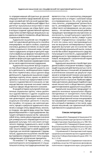 5. Кульбижеков В. Н. Аудиальное мышление в структуре художественного познания // Манускрипт. 2019. Т. 12, вып. 11. С. 164-167.