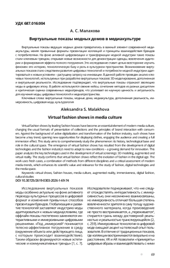 Виртуальные показы ведущих модных домов превратились в важный элемент современной медиакультуры, меняя привычные форматы презентации коллекций и принципы взаимодействия брендов с потребителями. На фоне активной цифровизации и трансформации модной индустрии такие показы стали ключевым трендом, открывая новые возможности для демонстрации одежды, вовлечения аудитории и формирования эффекта полного погружения. Это исследование ставит целью всесторонне изучить феномен: его историю, технологическую базу и роль в культурном пространстве. Возникновение виртуальных показов стало следствием развития цифровых технологий и потребности модной индустрии адаптироваться к новым условиям - растущему запросу на инновации. В данной работе проведен анализ ключевых технологий, используемых при разработке виртуальных показов: 3D-моделирование, дополненная и виртуальная реальности. Исследование подтверждает, что виртуальные показы отражают эволюцию моды в цифровую эпоху. В работе используются свежие кейсы, сочетание методов из разных дисциплин и критическая оценка современных медиатрендов, что усиливает ее научную ценность и актуальность для изучения моды, цифровых технологий и медиапространства.