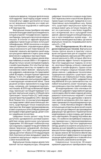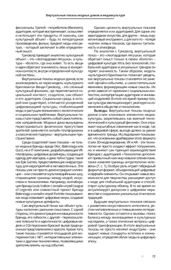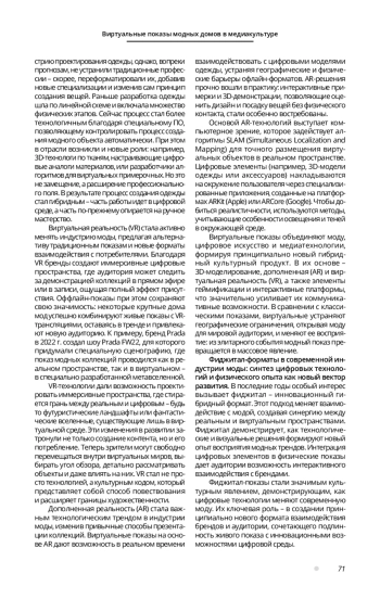 Виртуальная реальность (VR) стала активно менять индустрию моды, предлагая альтернативу традиционным показам и новые форматы взаимодействия с потребителями. Благодаря VR бренды создают иммерсивные цифровые пространства, где аудитория может следить за демонстрацией коллекций в прямом эфире или в записи, ощущая полный эффект присутствия. Оффлайн-показы при этом сохраняют свою значимость: некоторые крупные дома мод успешно комбинируют живые показы с VRтрансляциями, оставаясь в тренде и привлекают новую аудиторию. К примеру, бренд Prada в 2022 г. создал шоу Prada FW22, для которого придумали специальную сценографию, где показ модных коллекций проводился как в реальном пространстве, так и в виртуальном – в специально разработанной метавселенной
