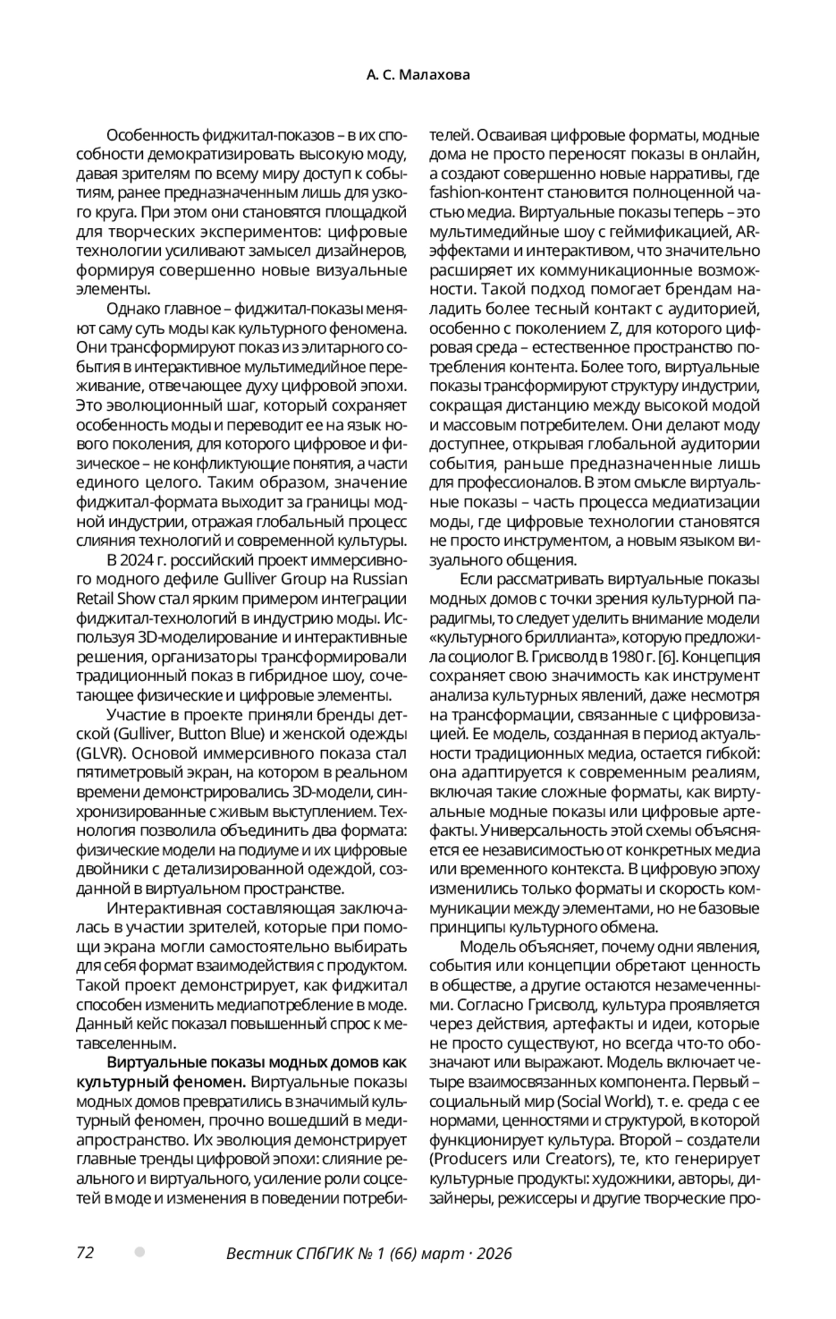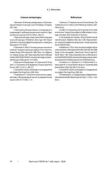 7. Хмелевская А. Г. Аксиологические аспекты цифровой моды // Международный научно-исследовательский журнал. 2022. № 11 (125). С. 1-4.