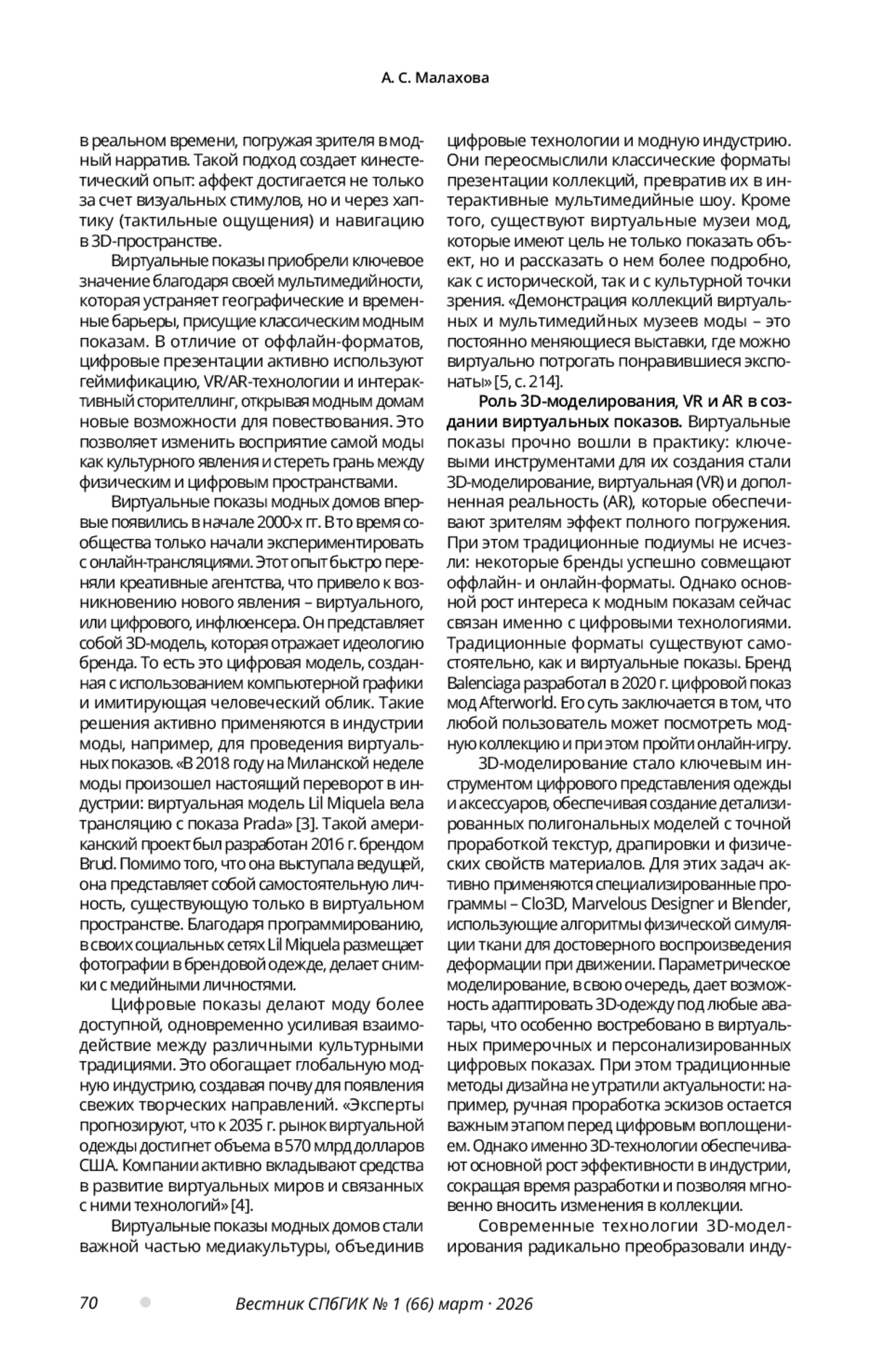 4. Малахова А., Флис К. Как виртуальные технологии помогают создавать реальную одежду// Как потратить. Северо-Запад. 2024. 8 марта (№ 1 (68)). Прил. к газ. “Ведомости. Северо-Запад”. URL: https://spb.vedomosti.ru/lifestyle/articles/2024/03/08/1024343-virtualnie-tehnologii-sozdavatodezhdu (дата обращения: 19.11.2025).