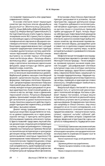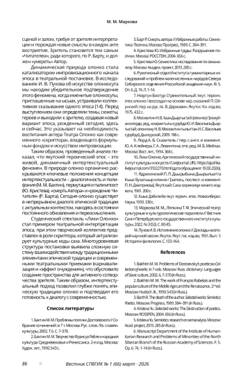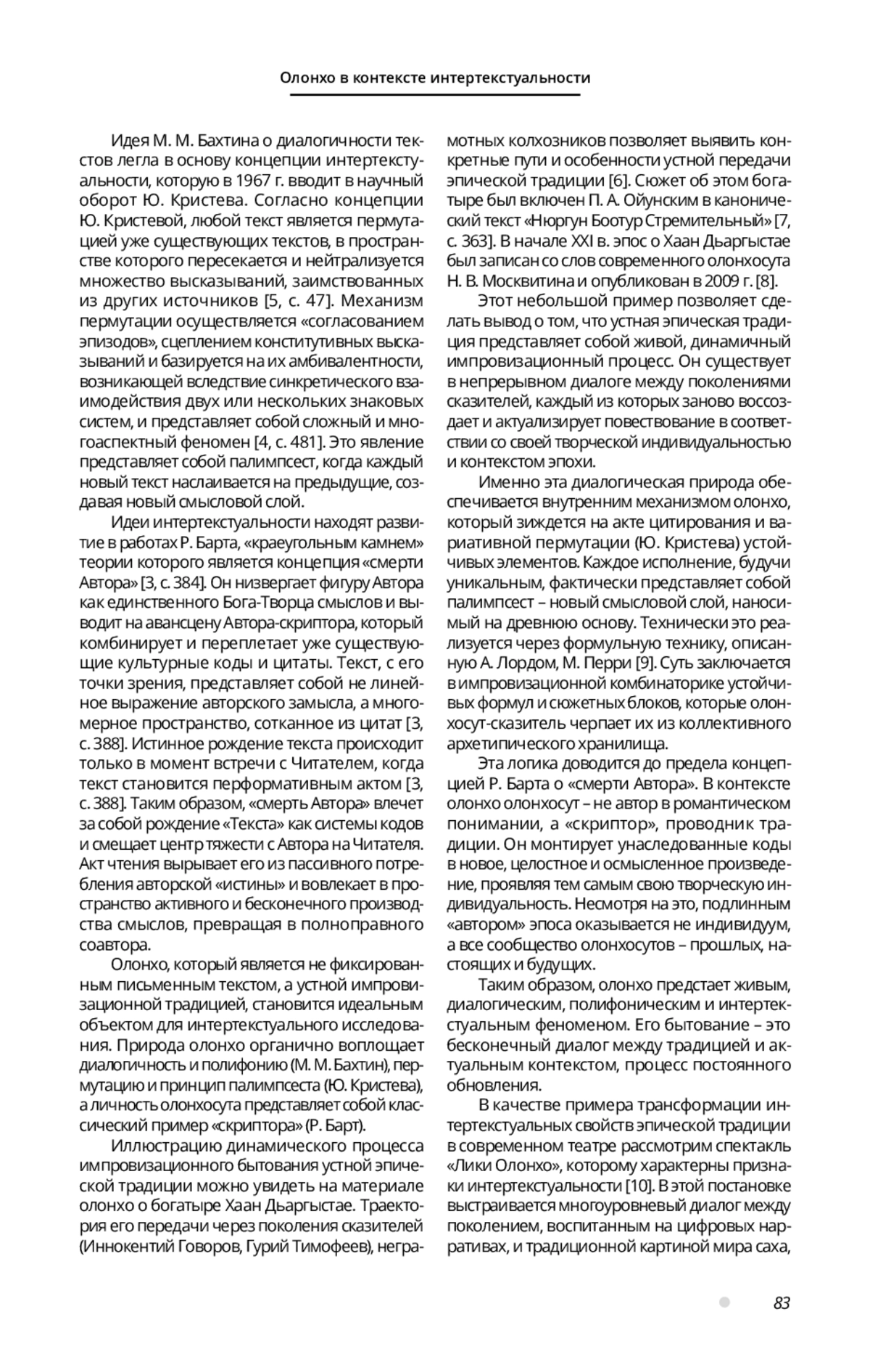 Многослойный и гетерогенный текст культуры саха якутский героический эпос олонхо исследуется в статье через призму теории интертекстуальности. Изначально разработанная для анализа литературных произведений, эта теория выступает продуктивным инструментом для изучения любых текстов культуры, включая фольклорные и театральные формы. В центре внимания статьи находится механизм трансформации эпического слова в театральное зрелище на примере современной постановки студенческого спектакля «Лики Олонхо», где якутский эпос эксплицируется как сложная коммуникационная система, синтезирующая элементы устного народного творчества, изобразительного искусства, музыкальной культуры, пластического кода и техники якутского сказительства, которая порождает новый художественный текст. Применение интертекстуального анализа раскрывает уникальную природу олонхо, не только как «архаичного» памятника, но и как сложную и живую диалогическую систему, открытую для современного прочтения.
