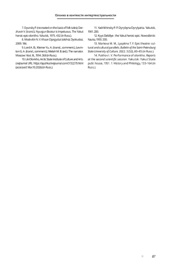 14. Пухов И. В. Исполнение олонхо // Доклады на второй научной сессии. Якутск: Якут. гос. изд-во, 1951. Вып. 1: История и филология. С. 133-164.