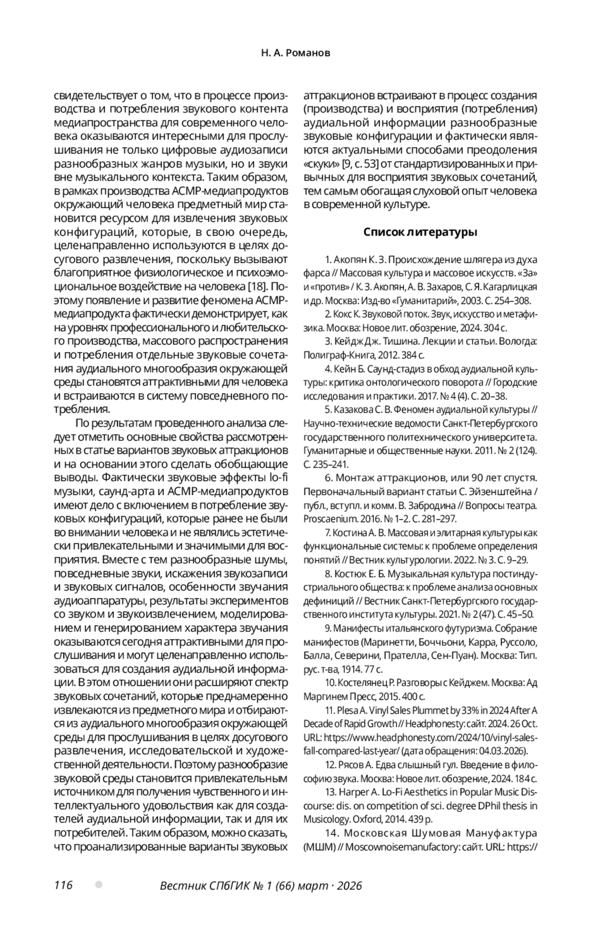 18. Романов Н. А. АСМР-медиапродукт в массовой цифровой медиакультуре // Вестник Санкт-Петербургского государственного института культуры. 2025. № 2 (63). С. 64-69.
