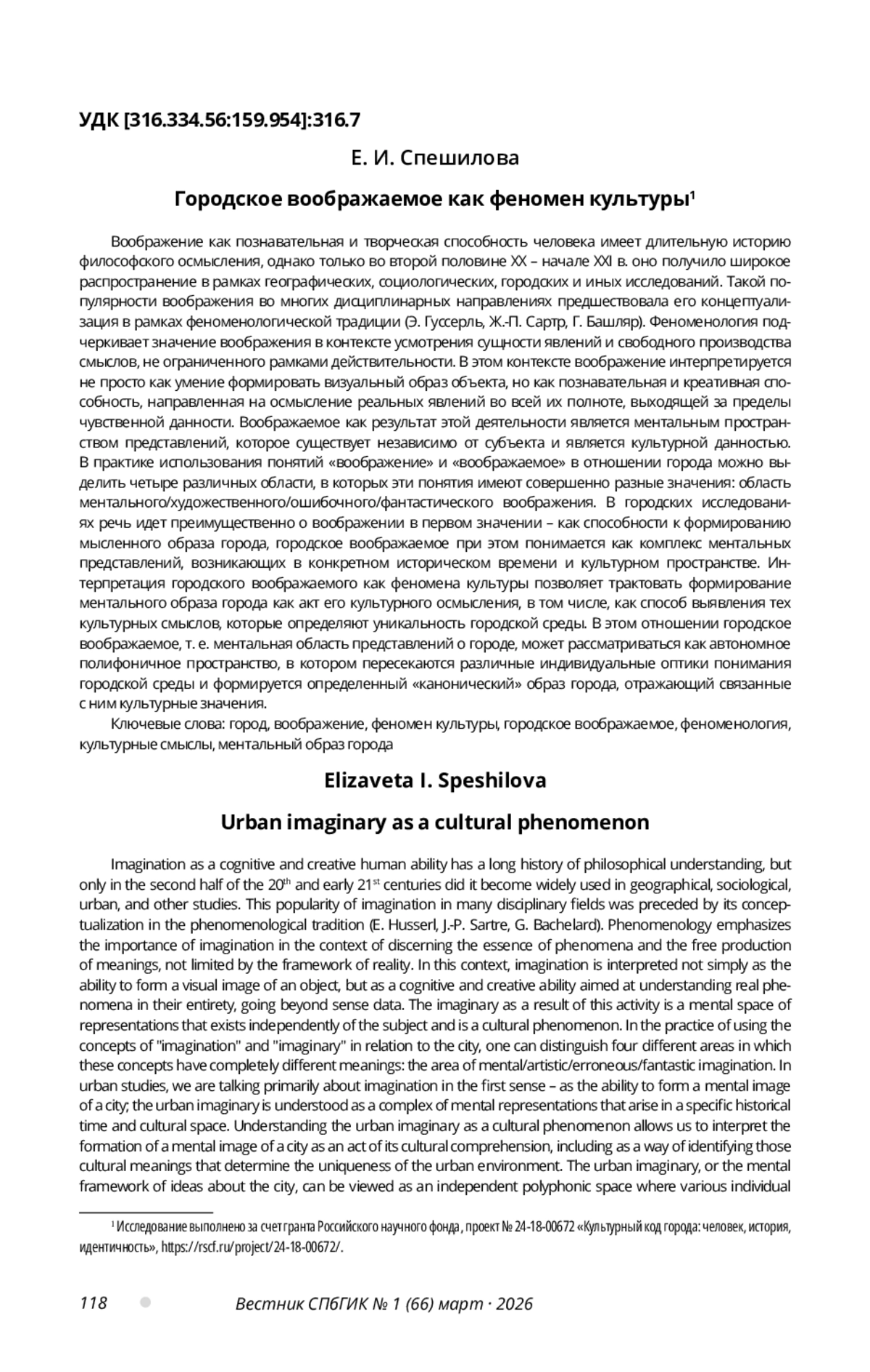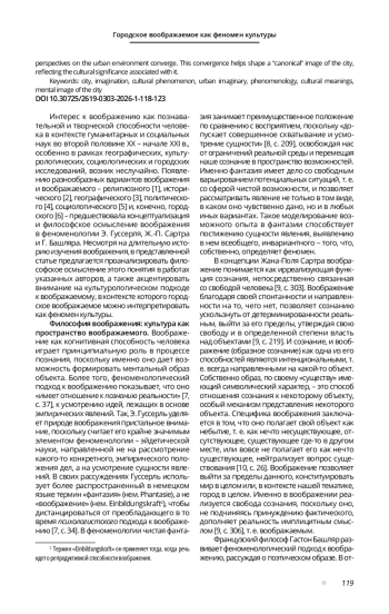 Интерес к воображению как познавательной и творческой способности человека в контексте гуманитарных и социальных наук во второй половине XX – начале XXI в., особенно в рамках географических, культурологических, социологических и городских исследований, возник неслучайно. Появлению разнообразных вариантов воображения и воображаемого – религиозного [1], исторического [2], географического [3], политического [4], социологического [5] и, конечно, городского [6] – предшествовала концептуализация и философское осмысление воображения в феноменологии Э. Гуссерля, Ж.-П. Сартра и Г. Башляра. Несмотря на длительную историю изучения воображения, в представленной статье предлагается проанализировать философское осмысление этого понятия в работах указанных авторов, а также акцентировать внимание на культурологическом подходе к воображаемому, в контексте которого городское воображаемое можно интерпретировать как феномен культуры.