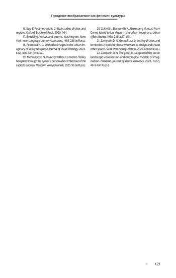 22. Замятин Д. Н. Геокультурное пространство Арктики: визуализация ландшафтов и онтологические модели воображения // ΠΡΑΞΗMΑ. Проблемы визуальной семиотики. 2021. № 1 (27). С. 48-94.