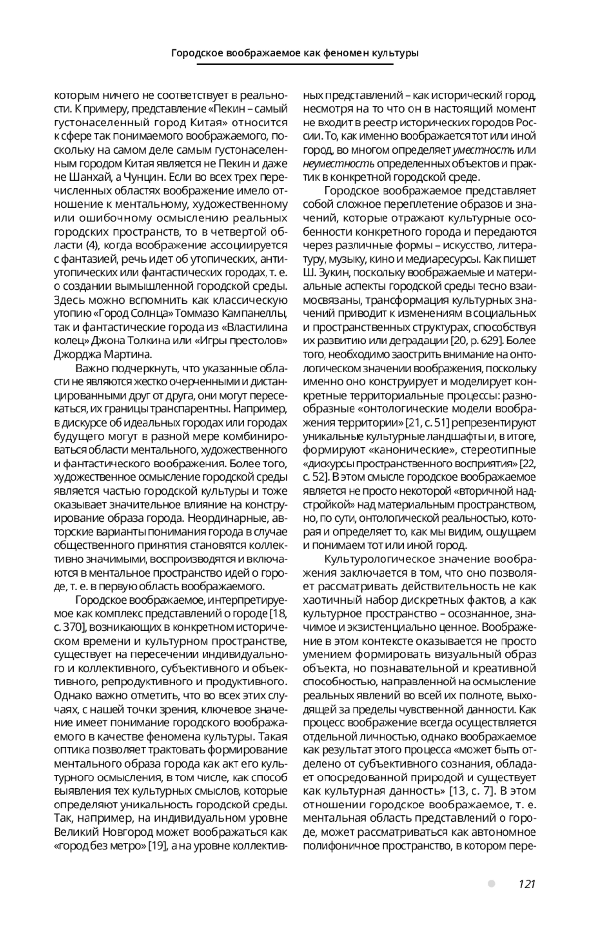 Воображение как познавательная и творческая способность человека имеет длительную историю философского осмысления, однако только во второй половине XX - начале XXI в. оно получило широкое распространение в рамках географических, социологических, городских и иных исследований. Такой популярности воображения во многих дисциплинарных направлениях предшествовала его концептуализация в рамках феноменологической традиции (Э. Гуссерль, Ж.-П. Сартр, Г. Башляр). Феноменология подчеркивает значение воображения в контексте усмотрения сущности явлений и свободного производства смыслов, не ограниченного рамками действительности. В этом контексте воображение интерпретируется не просто как умение формировать визуальный образ объекта, но как познавательная и креативная способность, направленная на осмысление реальных явлений во всей их полноте, выходящей за пределы чувственной данности. Воображаемое как результат этой деятельности является ментальным пространством представлений, которое существует независимо от субъекта и является культурной данностью. В практике использования понятий «воображение» и «воображаемое» в отношении города можно выделить четыре различных области, в которых эти понятия имеют совершенно разные значения: область ментального/художественного/ошибочного/фантастического воображения. В городских исследованиях речь идет преимущественно о воображении в первом значении - как способности к формированию мысленного образа города, городское воображаемое при этом понимается как комплекс ментальных представлений, возникающих в конкретном историческом времени и культурном пространстве. Интерпретация городского воображаемого как феномена культуры позволяет трактовать формирование ментального образа города как акт его культурного осмысления, в том числе, как способ выявления тех культурных смыслов, которые определяют уникальность городской среды. В этом отношении городское воображаемое, т. е. ментальная область представлений о городе, может рассматриваться как автономное полифоничное пространство, в котором пересекаются различные индивидуальные оптики понимания городской среды и формируется определенный «канонический» образ города, отражающий связанные с ним культурные значения.