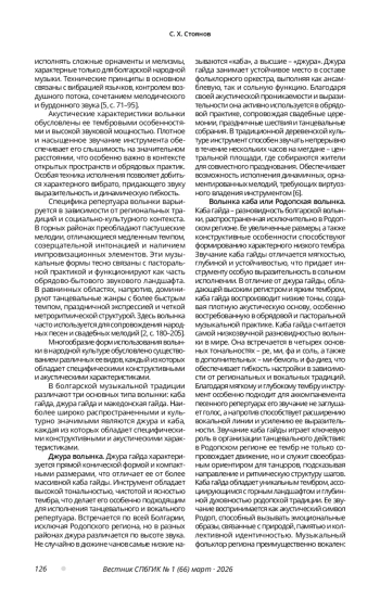 Болгарская волынка представлена как выразительный народный инструмент, обладающий уникальной этнофонетической спецификой. Анализируются тембровые особенности музыкального инструмента, его устойчивое звучание, способ звукоизвлечения, конструкция, роль в ритуальной и праздничной практике, а также функция в формировании локальной музыкальной идентичности. Волынка функционирует как акустический символ этнической идентичности, сопровождая обряды, календарные праздники и фольклорные постановки. Особое внимание уделено волынке джура и родопской каба гайде как эталону этнофонного звучания, способному вызывать глубокий эмоциональный отклик и сохранять связь между поколениями. Волынка рассматривается не только как музыкальный инструмент традиционной культуры, но и как носитель сакрального и этнокультурного смысла.
