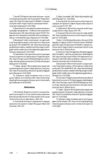 8. Димитрова И. О легендарном родопском волынщике Дафо Трендафилове - с любовью и восхищением // Радио Болгария. URL: https://bnr.bg/ru/post/101091113/olegendarnom-rodopskom-volinshtike-dafo-trendafilove-slubovyu-i-voshishteniem (дата обращения: 12.03.2026).