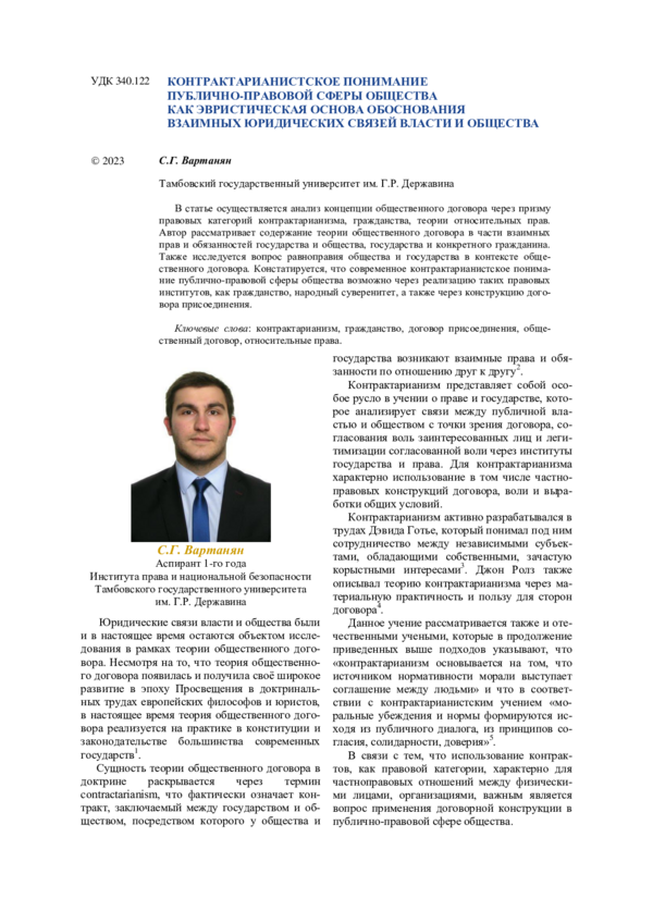 В статье осуществляется анализ концепции общественного договора через призму правовых категорий контрактарианизма, гражданства, теории относительных прав. Автор рассматривает содержание теории общественного договора в части взаимных прав и обязанностей государства и общества, государства и конкретного гражданина. Также исследуется вопрос равноправия общества и государства в контексте общественного договора. Констатируется, что современное контрактарианистское понимание публично-правовой сферы общества возможно через реализацию таких правовых институтов, как гражданство, народный суверенитет, а также через конструкцию договора присоединения.