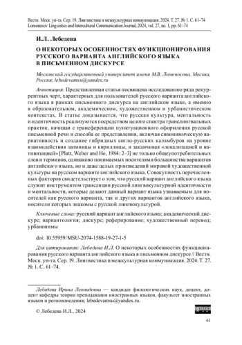 Представленная статья посвящена исследованию ряда рекуррентных черт, характерных для пользователей русского варианта английского языка в рамках письменного дискурса на английском языке, а именно в образовательном, академическом, художественном и урбанистическом контекстах. В статье доказывается, что русская культура, ментальность и идентичность реализуются посредством целого спектра транслингвальных практик, начиная с трансференции пунктуационного оформления русской письменной речи и способа ее представления, включая синонимическую вариативность и создание гибридных англо-русских каламбуров на уровне взаимодействия латиницы и кириллицы, и заканчивая «локализацией и нативизацией» [Platt, Weber and Ho, 1984: 2-3] не только общеупотребительных слов и терминов, одинаково понимаемых носителями большинства вариантов английского языка, но и даже целых произведений мировой художественной культуры на русском варианте английского языка. Совокупность перечисленных факторов свидетельствует о том, что русский вариант английского языка служит инструментом трансляции русской лингвокультурной идентичности и ментальности, которые делают данный вариант языка узнаваемым для носителей как русского варианта, так и других вариантов английского языка, носители которых знакомы с русской лингвокультурой.