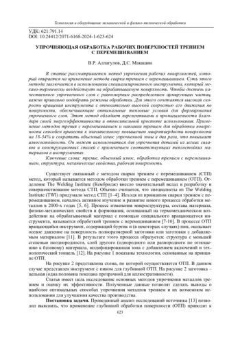 В статье рассматривается метод упрочнения рабочих поверхностей, который опирается на применение метода сварки трением с перемешиванием. Суть этого метода заключается в использовании специализированного инструмента, который механо-термически воздействует на обрабатываемую поверхность. Чтобы достичь качественного упрочненного слоя с равномерным распределением армирующих частиц, важно правильно подобрать режимы обработки. Для этого сочетаются высокая скорость вращения инструмента с относительно высокой скоростью его движения по поверхности, обеспечивающие оптимальные тепловые условия для формирования упрочненного слоя. Этот метод обладает перспективами в промышленности благодаря своей энергоэффективности и относительной простоте использования. Применение методов трения с перемешиванием и наплавки трением для обработки поверхности способен привести к значительному повышению микротвердости поверхности на 18-34% и сократить объемный износ упрочненной зоны в два раза, что повышает износостойкость. Он может использоваться для упрочнения деталей из легких сплавов и конструкционных сталей с применением соответствующих теплостойких материалов в инструментах.