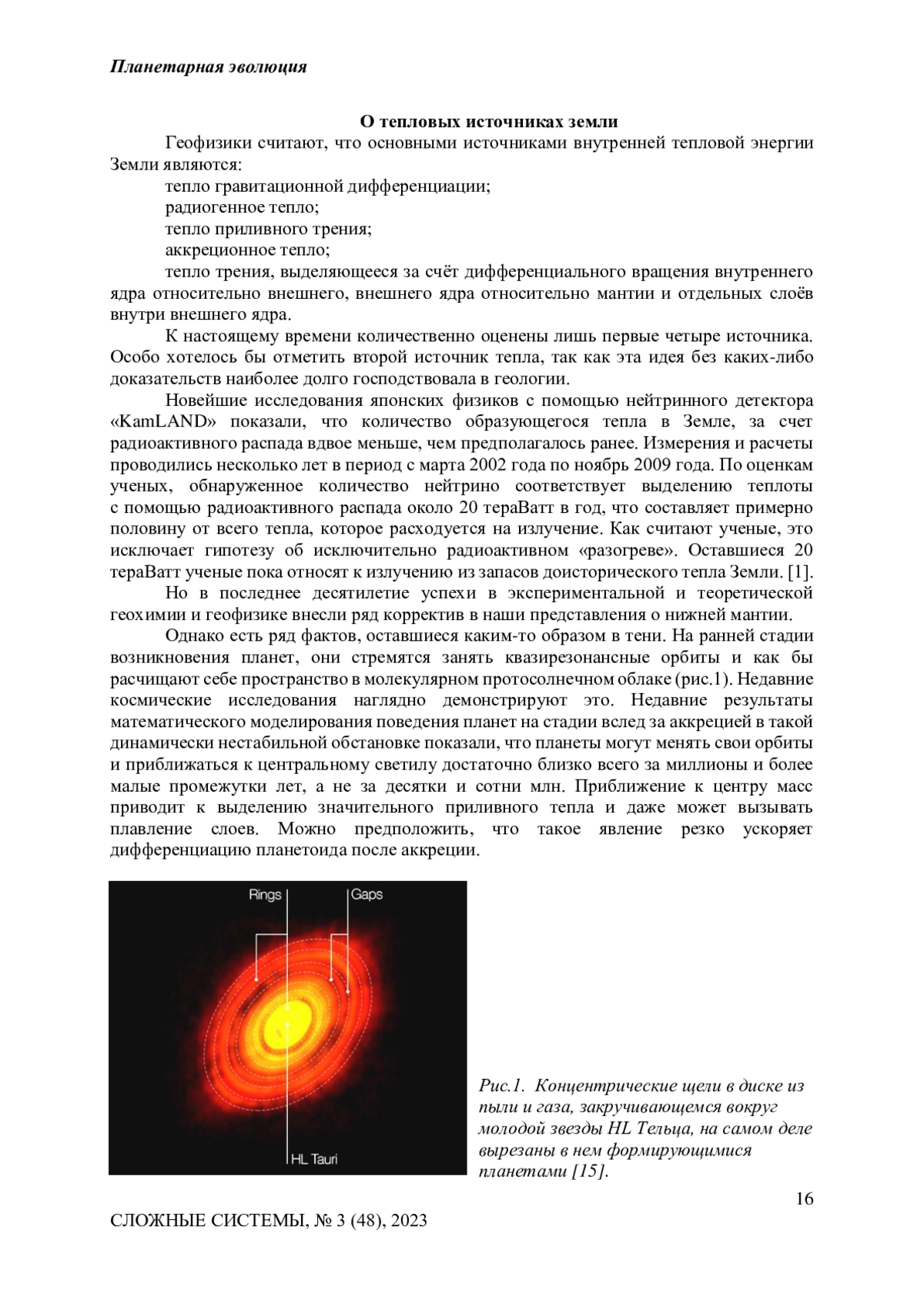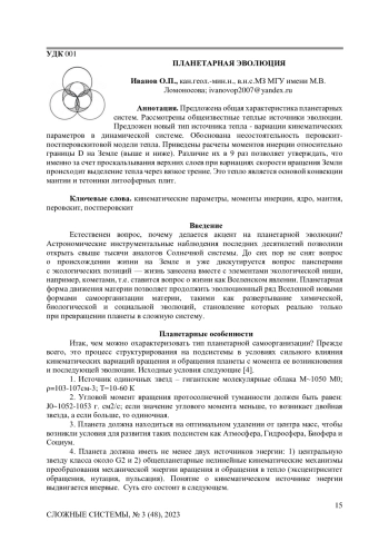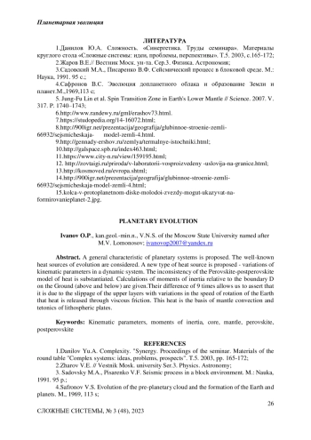 Предложена общая характеристика планетарных систем. Рассмотрены общеизвестные теплые источники эволюции. Предложен новый тип источника тепла - вариации кинематических параметров в динамической системе. Обоснована несостоятельность перовскит-постперовскитовой модели тепла. Приведены расчеты моментов инерции относительно границы D на Земле (выше и ниже). Различие их в 9 раз позволяет утверждать, что именно за счет проскальзывания верхних слоев при вариациях скорости вращения Земли происходит выделение тепла через вязкое трение. Это тепло является основой конвекции мантии и тетоники литосферных плит.
