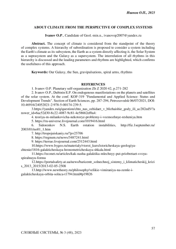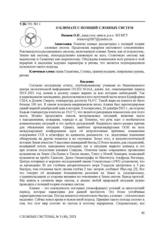 Понятие климат рассмотрено с позиций теории сложных систем. Предложена иерархия системного соподчинения. Рекомендуется рассматривать систему, включающую климат Земли, как её подсистему, Землю как систему, непосредственно влияющую на него, Солнечную систему как надсистему и Галактику как сверхсистему. Обсуждена взаимосвязь всех ритмов в этой иерархии и выделены ведущие параметры и ритмы, что является подтверждением полезности такого подхода.