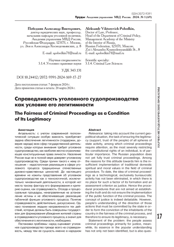 Актуальность: с учетом современной геополитической ситуации особую важность приобретает задача обеспечения легитимности (поддержки, доверия народа) всех сфер государственной деятельности, среди которых внимания требует уголовное судопроизводство, как наиболее жестко ограничивающее конституционные права личности. Население России еще не в полной мере доверяет уголовному судопроизводству. Среди причин такого к нему отношения - недостаточная реализация в сфере уголовного процесса традиционных отечественных духовно-нравственных ценностей. До настоящего времени не изжиты представления об уголовном судопроизводстве как о технологичной, исключительно чиновничьей деятельности, в которой нет места такому фактору его формирования и критерию оценки, как справедливость. Отсюда и процессуальные процедуры, ненаправленные на установление истины и не обеспечивающие реализацию публичной функции уголовного процесса. Понятие справедливости, действительно, дискуссионно. Однако понимание людьми направленности тех действий, которые должны быть совершены государством для формирования убеждения жителей страны в справедливости уголовного процесса, а значит для обеспечения его легитимности, необходимо. Постановка проблемы: народ оценивает уголовное судопроизводство прежде всего на справедливость, между тем ее сущность именно в народном понимании не только не выявлена, но и ставится под сомнение как предмет исследования в целях уголовного процесса. Между тем без обеспечения убежденности жителей страны в справедливости уголовного процесса вызывает сомнение его легитимность. Методология: исследование основано на методе диалектического материализма (проблема обеспечения справедливости уголовного судопроизводства исследуется на основе материалистического подхода к уголовному процессу как части надстройки, проявлению политики, основанной на общественном строе, конкурирующем с духовно-нравственными ценностями жителей России). Справедливость рассматривается с философских, социологических, юридических позиций во взаимосвязи с целями уголовного процесса и доказывания, функцией публичности, ролью граждан в уголовном процессе, правилами толкования уголовно-процессуального права и аналогией в судопроизводстве. Использовались общие методы: анализ (отдельно рассматривались факторы, обеспечивающие справедливость), синтез (справедливость изучалась как целостная категория, обеспечиваемая комплексом составляющих), социологический (оценивались официальные данные об оценке правосудия на справедливость), исторический (обращение к причинам сформировавшегося отношения населения к справедливости судопроизводства, проистекающим из предшествующих этапов реформирования судопроизводства). Применялся формально-юридический метод (текст уголовно-процессуального закона оценивался с точки зрения отражения в нем определенных ценностей и оптимальности формулировок). Результаты и ключевые выводы: по результатам исследования определена значимость справедливого понимания уголовного процесса как фактора обеспечения его легитимности, направления развития в уголовном судопроизводстве духовно-нравственных ценностей в виде непременного условия оценки уголовного процесса населением страны в качестве справедливого. Леги