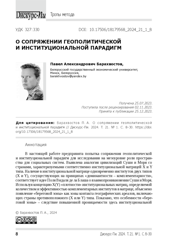 В настоящей работе предпринята попытка сопряжения геополитической и институциональной парадигм для исследования на мезоуровне роли пространства для социальных систем. Выявлена аналогия цивилизаций Суши и Моря со странами, характеризуемыми соответственно институциональной матрицей Х и Y типа. Наличие в институциональной матрице одновременно институтов двух типов (Х и Y), сосуществующих на принципах «доминантности – комплементарности», соответствует идее Поля Видаля де ла Блаша о взаимопроникновении Суши и Моря. Используя концепцию X(Y) «плотности» институциональных матриц, определяемой количеством и эффективностью комплементарных институтов в матрице, объяснено появление «береговой зоны» как зоны контакта географических ареалов, включающих страны противоположного (X или Y) типа. Показано, что особенности «береговой зоны» – следствие повышенной проницаемости здесь институциональной матрицы для институтов комплементарного типа. Обосновано, что географическое пространство играет важную роль в жизни общества, однако, вследствие наличия комплементарных институтов в институциональной матрице, связанного с деятельностью людей, направленной на преобразование природной и институциональной среды, не следует говорить об абсолютном географическом детерминизме. Показано, что в современных условиях жизненно важной необходимостью социальных систем является не территориальное расширение, а интеграция в различных формах. Как правило, интеграционные союзы не являются абсолютно симметричными и включают «ядро» и периферию. В ходе интеграционных процессов наблюдается институциональная конвергенция, которая обеспечивается за счет трансплантации институтов более успешного и эффективного «ядра» на периферию и двунаправленной институциональной диффузии. Таким образом, внутри союзов образуются каналы институционального расширения интегрируемых социумов. Показано, что особенности формируемых при этом региональных порядков и регионального регулирования задаются преобладающим в регионе типом институциональных матриц (X или Y). При этом если интегрируются общественные системы X-типа, то институты в основе регионального порядка и регионального регулирования относятся к Y-типу, и наоборот. Новые институты, возникшие как следствие интеграционных процессов, выполняют компенсаторную функцию, обеспечивая скомпенсированное, сбалансированное развитие как отдельного социума, так и всего регионального интеграционного объединения в целом.