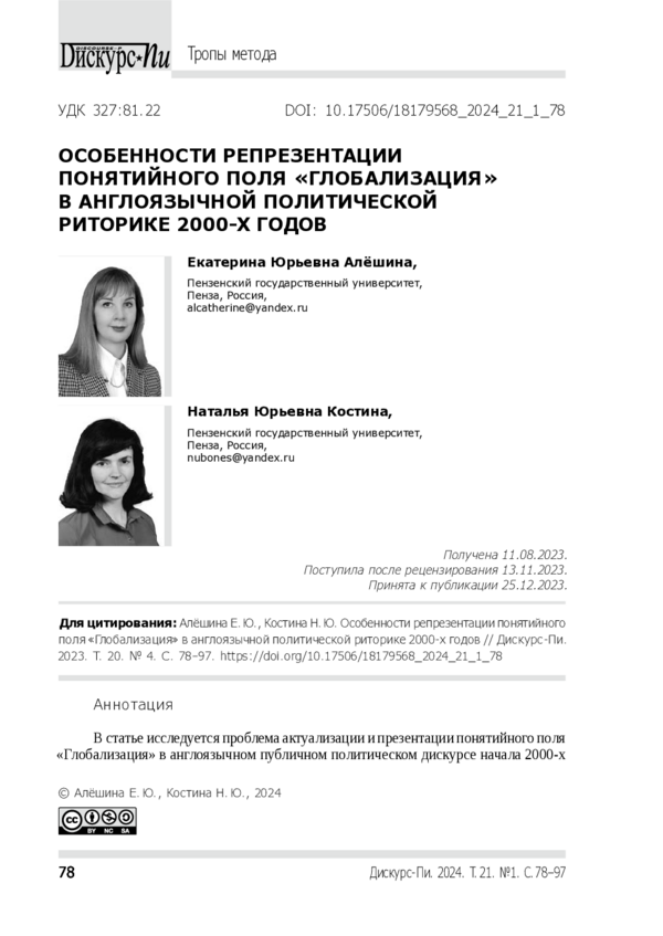 В статье исследуется проблема актуализации и презентации понятийного поля «Глобализация» в англоязычном публичном политическом дискурсе начала 2000-х годов. Актуальность обусловлена особенностями геополитической ситуации периода, когда глобализационный процесс, подкрепленный теорией неолиберального экономического развития, явился точкой пересечения экономических интересов англосаксонской элиты с политическими, имплицитно подразумевая заявку на построение новой модели мироустройства. В условиях быстротекущих и нарастающих изменений общественного сознания и политической ситуации разрабатывались стратегии воздействия на мировое общественное мнение в направлении складывания картины «уверенных целенаправленных процессов с четким руководством» на фоне всеобщей нестабильности и хаотичности изменений. Цель исследования можно определить как выявление специфики формирования понятийного поля «Глобализация» в лексической системе английского языка как результата когнитивного освоения социального конструкта нового типа с последующей реализацией и модификацией в дискурсивной практике политического общения. Таким образом, в центре исследовательского интереса находятся механизмы информационного освоения изменяющегося социального опыта через языковые знаки, а также процесс пополнения и модификации полученной информации в когнитивно-деятельностной коммуникации. Отмечается, что рассматриваемое понятийное поле коррелирует с фазами развития политического и экономического проекта «Глобализация». В ис-