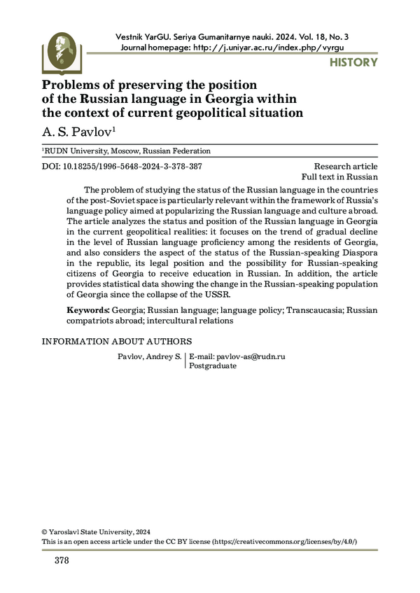 ПАВЛОВ А. С. ПРОБЛЕМЫ СОХРАНЕНИЯ РУССКОГО ЯЗЫКА В ГРУЗИИ В КОНТЕКСТЕ СОВРЕМЕННОЙ ГЕОПОЛИТИЧЕСКОЙ КОНЪЮНКТУРЫ // ВЕСТНИК ЯРОСЛАВСКОГО ГОСУДАРСТВЕННОГО УНИВЕРСИТЕТА ИМ. П. Г. ДЕМИДОВА. СЕРИЯ ГУМАНИТАРНЫЕ НАУКИ. 2024. ТОМ 18. № 3 (69)