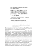 В настоящей статье рассматривается коптская рукописная традиция «Определений Первого Никейского Собора» - также известных в научной литературе как «Каноны Никейского Собора» - на основе двух памятников из собрания Белого монастыря: MONB. EF (CLM 359) и MONB. FT (CLM 393). Вводная часть содержит общее описание состава коптских никейских сборников и их места в коптской канонической литературе. Основное внимание уделяется анализу текстов обеих рукописей, в том числе их палеографических, лексических и синтаксических особенностей, а также сопоставлению с греческим оригиналом. Особо подчёркивается высокая степень стилистических расхождений между двумя коптскими версиями, отражающая характерную для монастырской среды свободу в передаче канонического материала. В рамках статьи впервые публикуется полный текст рукописи MONB. FT с русским переводом, а также предлагается новое издание текста MONB. EF с реконструкцией повреждённых фрагментов на основе греческого оригинала и внутренней коптской традиции.