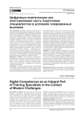 Результаты. В данной статье доказано, что цифровые компетенции в современный период являются одним из главных компонентов при подготовке высококвалифицированных специалистов. Цифровые компетенции позволяют выпускникам различных направлений образования реализовать индивидуальные траектории развития и сразу же после окончания вуза занять высокооплачиваемые должности на конкурентоспособных предприятиях в различных регионах страны. В данной работе выявлен целый ряд факторов, которые обуславливают необходимость интенсивного обучения цифровым компетенциям. К их числу относятся высокие скорости передачи информации, необходимость проводить аналитику данных с помощью статистического, математического и системного анализа, многозадачность и умение работать с современными программными продуктами и цифровыми устройствами. Кроме того, цифровые компетенции выпускников вузов в цифровую эру учитывают весь спектр запросов работодателей, что в свою очередь способствует повышению уровня конкурентоспособности отраслей и сфер экономики и успешной реализации стратегий социально-экономического развития страны.