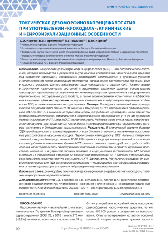 Обоснование. Токсическая дезоморфиновая энцефалопатия (ТДЭ) — это патологическое состояние, которое развивается в результате внутривенного употребления наркотического средства под названием «крокодил», содержащего дезоморфин, изготовленный в кустарных условиях с использованием кодеинсодержащих препаратов, органических растворителей (бензина), йода и красного фосфора. Данное заболевание чаще наблюдается в странах СНГ. Помимо острых и хронических патологических состояний с поражением различных органов, использование « крокодила» характеризуется выраженными экстрапирамидными проявлениями в виде дистонии, паркинсонизма, постуральных расстройств, а также возникновением когнитивных и аффективных нарушений.