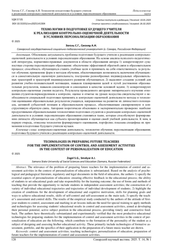 Обоснована актуальность проблемы подготовки будущего учителя к реализации контрольно-оценочной деятельности в условиях персонализации образования. На основе анализа психолого-педагогической литературы, нормативно-правовых документов в области образования авторы 1) конкретизируют сущностные стороны персонализации образования: обеспечение эффективной обратной связи в образовательном процессе; способность обучающихся ставить учебные цели и принимать на себя ответственность за результат обучения; применение форм и методов обучения, обеспечивающих возможность включения обучающихся в самостоятельную оценочную деятельность; построение разнообразных индивидуальных образовательных траекторий и траекторий индивидуального развития обучающихся; 2) выделяют создание условий для развития учебно-познавательной мотивации, навыков планирования целей и путей достижения образовательных результатов, навыков самоконтроля и самооценки в качестве основной задачи; 3) конкретизируют контрольно-оценочные умения педагога. Результаты проведенного авторами эмпирического изучения отношения студентов-первокурсников к контролю, оценке и отметке на уроках искусства свидетельствуют о необходимости специальной подготовки применять в контрольно-оценочной деятельности методы и технологии оценивания образовательных результатов учащихся, направленные на развитие их личностного потенциала, активной субъектной позиции в образовательном процессе, обеспечивающие своевременную и конструктивную обратную связь. Авторами теоретически обосновано и экспериментально проверено: наиболее продуктивными образовательными технологиями подготовки студентов к реализации контрольно-оценочной деятельности в условиях персонализации образования становятся такие, которые способствуют формированию личности обучающегося как субъекта проектирования и оценки своей учебной деятельности. К ним, в первую очередь, отнесены технологии формирующего оценивания, портфолио; показана специфика их применения в подготовке будущего учителя музыки.