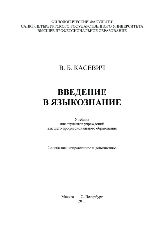 Введение в языкознание : учебник для студ. учреждений высш. проф. образования / В. Б. Касевич. — 2-е изд., испр. и доп. — СПб.: Филологический факультет СПбГУ; М.: Издательский центр «Академия», 2011. — 240 с