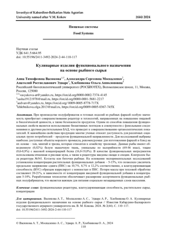 Статья: КУЛИНАРНЫЕ ИЗДЕЛИЯ ФУНКЦИОНАЛЬНОГО НАЗНАЧЕНИЯ НА ОСНОВЕ РЫБНОГО СЫРЬЯ