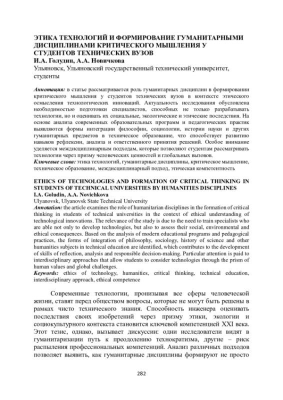 Голудин, И. А. Этика технологий и формирование гуманитарными дисциплинами критического мышления у студентов технических вузов / И. А. Голудин, А. А. Новичкова, М. П. Волков // Техногенная цивилизация перед лицом вызовов : Сборник научных трудов X Международной научно-теоретической конференции, посвященной памяти доктора философских наук, профессора В.И. Белозерцева, Ульяновск, 19–20 сентября 2025 года. – Ульяновск: Ульяновский государственный технический университет, 2025. – С. 283-287. – EDN TKHYFC.