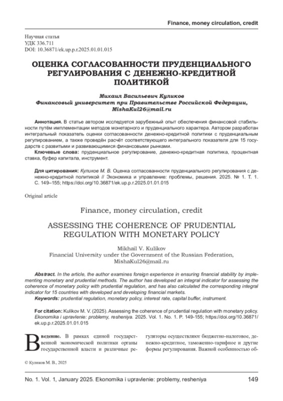 Статья: ОЦЕНКА СОГЛАСОВАННОСТИ ПРУДЕНЦИАЛЬНОГО РЕГУЛИРОВАНИЯ С ДЕНЕЖНО-КРЕДИТНОЙ ПОЛИТИКОЙ