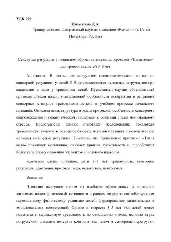 В статье анализируются исследовательские данные по сенсорной регуляции у детей 3–5 лет, выделяются основные затруднения при адаптации к воде у тревожных детей. Представлен научно обоснованный протокол «Тихая вода», учитывающий особенности восприятия и регуляции сенсорных стимулов тревожными детьми в учебном процессе начального плавания. Описаны цели, структура и этапы протокола, особенности сенсорного сопровождения и педагогической поддержки в создании среды минимального стресса. Представлены данные пилотных исследований: показатели тревожности, успехов в освоении базовых навыков плавания и поведенческие маркеры сенсорной регуляции. Показано, что применение протокола «Тихая вода» повышает мотивацию, снижает уровень тревожности и способствует более успешному освоению элементов начального плавания.