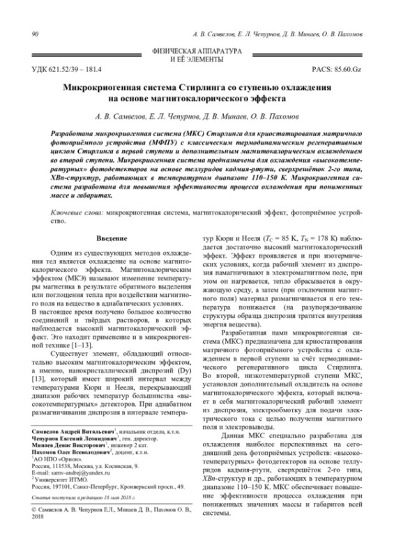 Статья: Микрокриогенная система Стирлинга со ступенью охлаждения на основе магнитокалорического эффекта